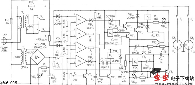 图中,R2、R4、R5、R6 5只取样电阻的实际值应为:470kΩ±3kΩ、3.7kΩ±300Ω、1.5kΩ±100Ω、1.8kΩ±100Ω、8.2kΩ±200Ω;发光二极管VD5:BT312(红色);VD15、VD17:BT313(绿色);稳压二极管VD10、VD14:2CW10(1.5~2.5V),可用3只3DG发射结串联代替;三极管VT1:9013,β=70;VT2、VT4、VT5:9013,β≥100;VT3、VT6、VT7:9013,β=100;VT8:9012,β=100;VT9:9012,β≥100;VT3、VT7、VT8 3只管子的穿透电流应不大于0.5μA;集成电路Al~A4:LM324;C9电容的漏电阻用指针式万用表1k挡测量应不小于1.5MΩ;T1采用普通36V±4V电源变压器,变压器的功率为20W、40W、60W时,稳压器的负荷容量分别为110W、220W、330W;4只继电器Kl~K4采用JZC-21F(T70)小型继电器,触头电流有3A、5A、8A三种规格,可根据稳压器的负载情况选用相应的规格;T2采用普通的3W电源变压器,次级电压为6.5~7V;其他元器件按如图所示参数选用即可。