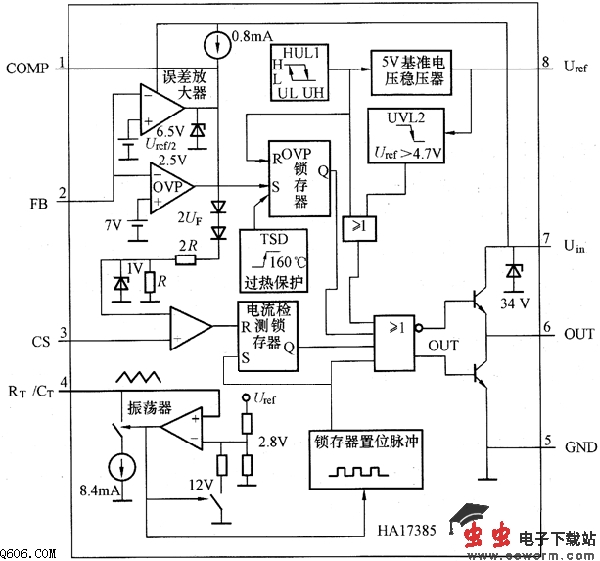 HA17385开关电源集成控制器采用8脚的DIP封装形式,图为内部等效电路框图。由等效电路框图可得知,HA17385片内有5V基准电压稳压器、振荡器(三角波发生器)、误差放大器及功率MOSFET驱动电路等构成开关电源所需要的全部电路。PWM波的最大占空比由接在振荡器RT疌T端子的电阻与电容设定。