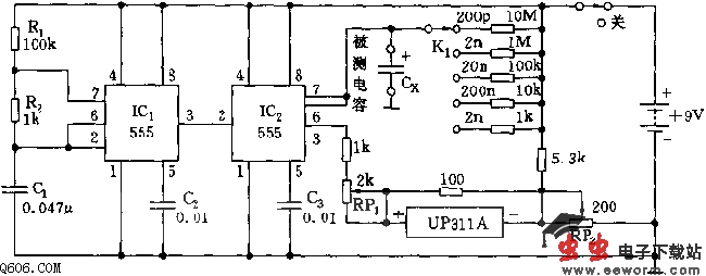 由于R1》R2,故振荡脉冲的占空比高达98%。它输出的脉冲波形作为IC2的控制波。IC2与待测电容Cx和各量程电阻等组成可控振荡器。利用振荡周期与Cx的容量大小成正比的关系,将电容量变换成相应的电压值,并在数字面板表UP311A(3位半)上显示数字读数。RP1用于调节满量程,RP2用于调节表头零点。要求与开关K1相连得电阻的允许精度为正负1%,以保证测试精度。