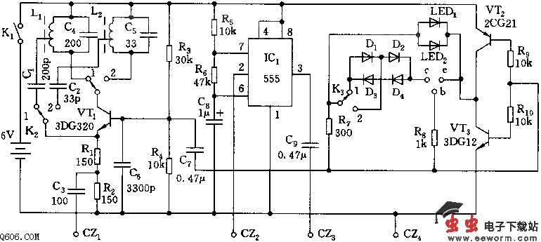 VT1、L1、L2、C1~C7及555振荡器组成点频信号产生电路。K2在“1”处,CZ1输出465、930、1395kHz的调幅信号,用以检修收音机、收录机等;K2置“2”处,CZ1输出37、74、148MHz电视横条信号,用以检修高频头和通道部分。CZ4为公共地。
