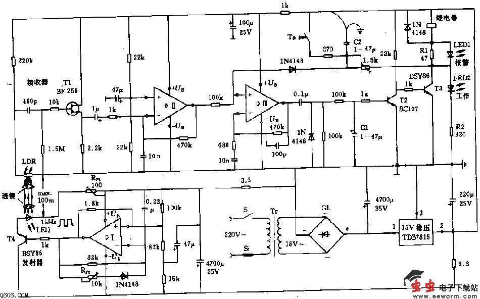 接收器输入端为光敏电阻或光敏晶体管。脉冲光变换为交流电压,由场效应晶体管T1控制运算放大器0II,其输出控制运算放大器0III。为了能在较差或较远的条件下接收信号,从0H输出的信号还需要进一步通过T2、T3放大。