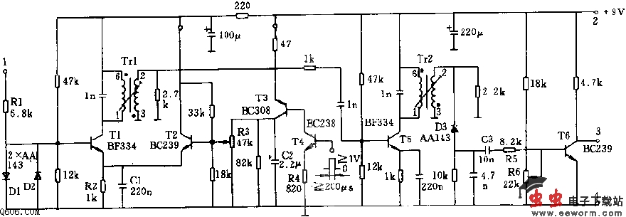 该电路工作电压9V,消耗电流仅5mA,可在家150~180kHz范围内调整频率,带宽约为了20kHz,以确保只有宽于70us的脉冲才能通过和被放大。