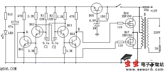 这是一款非常容易制作的逆变器,可以将12V电源电压变为220V市电,电路由BG2和BG3组成的多谐振荡器推动,再通过BG1和BG2驱动,来控制BG6和BG7工作。