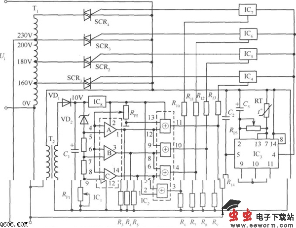 图中,T1:自耦变压器;Y2:取样变压器;ICl:LM339;IC2:CD4070;IC3:TWH9205; IC4~IC7:TWH8778;IC8:W7806;电阻Rl、R2:150Ω;R3~R9:10kΩ;Rl0~Rl3:20kΩ;R14:20kΩ、4W;热敏电阻RT:47kΩ;RPl:680Ω;Rp2:4.7kΩ;Rp3:100kΩ;Cl:47μFl6V;C2:0.1μF;C3:100μF16V;VD1:lN4002;VD2:2CW54;可控硅SCRl~SCR4可据负载功率的大小来合理选择。