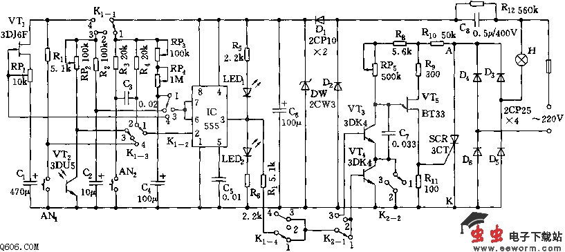 当K1置“3”位置,K2置“1”位,为光控开关电路,RP2用于调节VT2对IC的触发端的起控点。当K1置“4”时,根据延时需要选择K2的位置,可进行延时开、关的功能动作。
