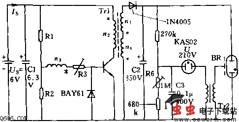 图示电路充电电压可由电位器R6调整,利用电位器R3可调整晶体管峰值电流。