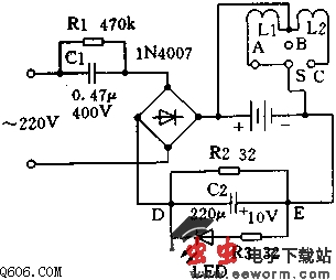 充电器电路如图所示,它由充电和照明两部分电路组成。工作过程简述如下:~220V电压经电容器C1限流后通过二极管整流,整流得到的脉动电流通过电池和ED网络,达到对电池充电和充电指示的目的。因为电容器容抗[1/(wC1)]比充电回路阻抗大很多,回路电流(充电电流)主要由C1值确定,所以该充电方式属于恒流型,电路中电容C1值为0.47uF(容抗约为6.8k欧),给电池充电的电流约为30mA。ED网络是充电指示电路,R2起分流作用,使流过LED的电流小于10mA。电解电容C2起贮能作用,使LED发光指示稳定。电阻R1是C1的泄放电阻。