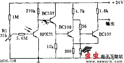 该电路适于用作光栅开关,并且具有很高的接收灵敏度,电路的开关阈值为10lx。为了调节无照电流,电路中接入电位器R1.当光敏晶体管上有足够光照度(最低为10lx)时,末级晶体管导通,输出端电压约为19.5V.