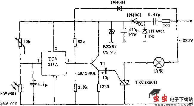 开关控制200W灯,供电电压为220V,约在光照100lx左右灯会自动开或关。在外界环境光较暗时光敏电阻呈高阻值,在阈值开关输入端的电压高于脚2处电压约0.7倍,其输出端也呈高阻值,于是电网电压通过分压电阻使后接的晶体管正半周周期导通,并在发射极处每半周期形成一个触发脉冲,使负载通电。当光照较强(大于100lx)时,阈值开关输出端变负,使晶体管及双向晶闸管门极无电流,电路不通。电路中需要的直流电压由二极管D1和D2整流后取得。控制电路需要的电流约15mA。