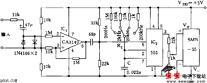如图采用3-1/2位SMB-35型数字面板表。该面板表用于对直流电流或电压的测量、显示。为进行频率的测量,应将输入频率信号变换成直流电压信号。为此,在电路的输入端采用BIMOS型运算放大器CA3140和555单稳态定时电路,将频率变为电压,然后接至SMB-35面板表,进行A/D变换,驱动LED数码管显示。555和各档电阻R及C组成单稳定时电路,定时时间td=1.1RC.与K1连接的四个电阻的精度为正负1%,以保证计数精度。