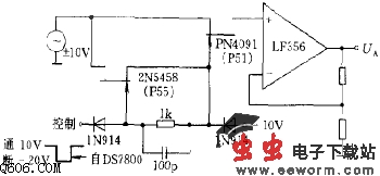 在要求快速、准确和可靠地换接高电平时,可以采用图示的电路(例如用于数字-同步变换器)。反馈网络可稳定输出信号,抵消因电路参数变化引起的输出变化的影响。在正负10V之间变化的交流输入信号和加在场效应晶体管的栅极上的-20V直流电压共同作用,使输入通道截止。场效应晶体管栅极为+10V时接通输入通道,并经后接的运算放大器输出。