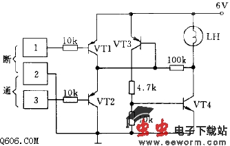 电路中触摸印刷电路板上的2、3铜覆盖层,则晶体管VT2、VT3和VT4导通,指示灯LH发亮。如果触摸1、2两接触面,则晶体管VT1导通,指示灯不亮。