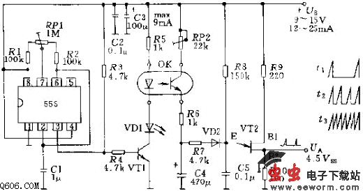 图中示出可以产生升音和降音两种声音的电笛电路。电笛声音是由经过光电耦合器耦合的两个发生器(定时器555和单结晶体管2N2648)产生的。由发生器555产生0.3Hz的频率信号,它使单结晶体管VT2声音发生器以这个节奏不断地增强或减弱。