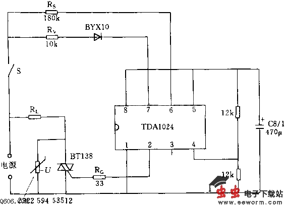 电路中开关S闭合后集成触发器TDA1024的电路接通。每当电网电压过零时就产生一个触发脉冲,使双向晶闸管导通,负载Rl流过全电流。而当开关S断开时负载中无电流。为了保护双向晶闸管,在其两端并联压敏电阻。该电路最大输出功率为1400W,如晶闸管采用BT139,则输出功率可至2000W,采用BTW41,输出功率可达5000W.