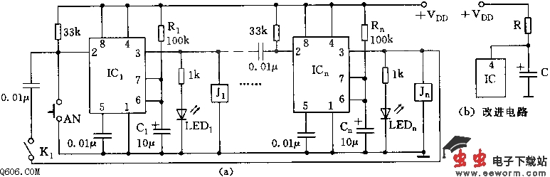 图a电路当开机通电时,有几支LED发光管同时闪烁现象,为此,改进电路如图b所示。在接入R、C网络后,开机时,由于C上电压不能突变,使复位端4脚处于强制复位状态,3脚均呈低电平输出,随着电容C的充电,使4脚呈高电平,各级IC处于等待触发定时状态,提高了测试的准确性。