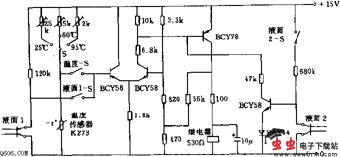 电路中,如果热敏电阻K273达到了整定的温度或者液面2处传感器电极不再浸入液体中,则通过接通继电器使之加热。这就保证了,在接通加热时总会有最低液体量在容器中。