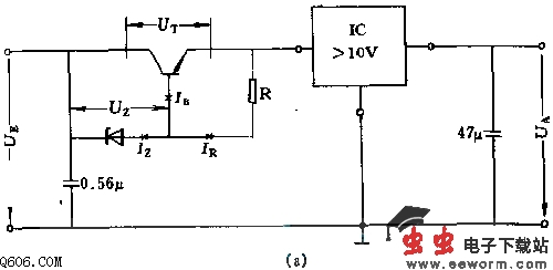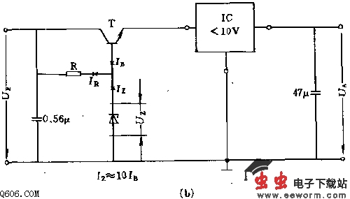 由电压方程Ue=Ut+Ur+Ua可知,晶体管上电压Ut的大小将决定输出电压Ua的最大值。同时应有Ur》2V.电压Ut取决于稳压管稳压值Uz的选择。图a中的电阻R的选取要满足Iz=Ib+Ir式的边界条件或Ir≈10·Ib的原则。此电路适于集成电路有较高工作电压的场合,在较低电压时,例如Ue=5V,则应采用图b电路。稳压管的稳压值至少高出输出电压Ua4V.电阻R的选择同电路a。