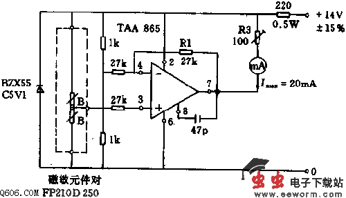 该电路采用磁敏元件对FP210P250,它们同两个1k欧电阻组成桥式电路,并接在运算放大器的输入端。桥路电压由稳压管稳压,以使其不受电源电压波动的影响。利用反馈电阻R1和小铁片同磁敏元件的距离可以实现行程控制输出电流大小的作用。利用电阻R3调节毫安表指针在中点两侧最大偏移的幅度。