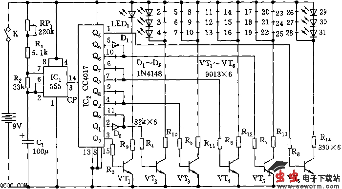 555和RP1、R1、R2、C1组成无稳态多谐振荡器,振荡频率f=1.44/(RP1+R1+2R2)C1.振荡周期T=1/f在0.5~15秒,可调。它的输出作为IC2的计数时钟,IC2采用十进制计数器/脉冲分配器CC4017,在时钟作用下,Q0~Q9依次出现高电平脉冲,脉冲宽度为时钟周期,将对应的VT1→VT6依次饱和导通,则对应的各路LED1~LED31发光二极管依次点亮,如圣诞树布置得当,犹如群星闪烁,增加节日气氛。IC2计数七次后,VT5→VT1依次饱和导通,LED28→LED1依次点亮。周而复始,循环不已。