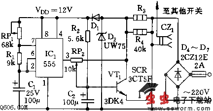 IC1(555)和RP1、R1、C1组成无稳态多谐振荡器,振荡周期T=0.693(RP1+2R1)C1,约在1~10秒,可通过调节RP1来选定。IC1输出的脉冲波经RP2、C2进行积分后,加至VT1,控制SCR的导通与截止,从而控制彩灯的点亮或熄灭。