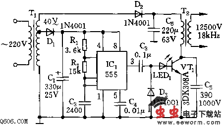 这种电源是以一块时基电路555为核心组成的,电路如图所示。555和R1、R2、C2等组成一个多谐振荡器,其振荡频率f=1.44/(R1+2R2)C2