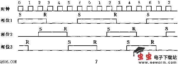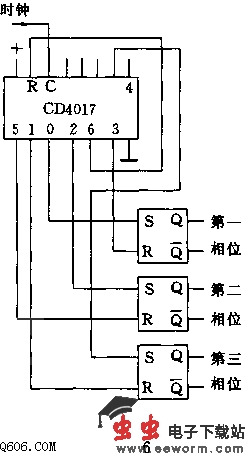 时钟脉冲如图7说明了全过程:第2相位滞后第1相位120度,第3相位滞后第1相位240度。三个双稳触发器根据4017十进制计数器脉冲设置、复位,第一次计数时第1相位转为高电位,到第三次计数转为低电位,计数以60度为限;到第六次计数时,第1相位再次转为高电位。第2相位在第二次计数设置(2X60=120),第五次计数复位(5X60=300),第3相位在第四次计数设置(4X60=240),三次计数后复位。其它相位关系其方法相类似。如果需要,可用低通滤波器除去正弦波产生的奇次谐波。