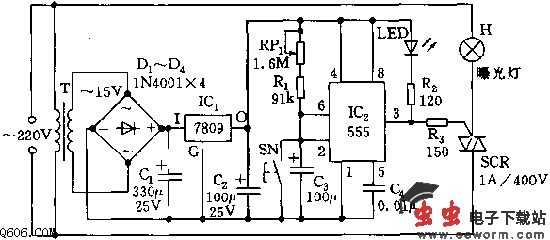 在555定时期间,可控硅SCR被触发导通,将曝光灯泡点亮,对照片进行曝光;定时到,555自动翻转复位,3脚转呈低电位,SCR截断,H灯熄灭。与此同时,指示灯LED点亮,表明曝光已毕。图中变压器T选用次级电压为12~15V、0.5W交流变压器;可控硅SCR可选用耐压在400V以上的双向可控硅,如3CTS-1A/400V;LED选用5mm红色发光二极管。