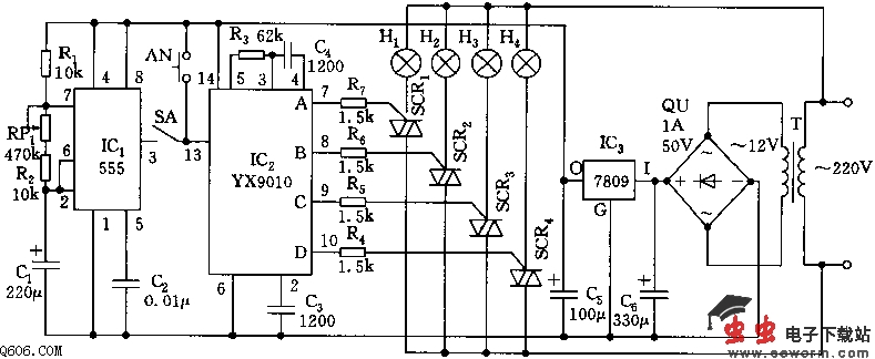 彩灯控制电路由多谐振荡器,控制电路和可控硅触发电路及降压供电电路等组成。交流降压整流电路为IC1、IC2提供+9V的直流电压。IC2采用彩灯控制专用集成电路YX9010,其芯片内存有八种彩灯控制方式。这种集成块的外围电路十分简单。对它的控制可采用手动或自动方式。AN为手动开关,每按压一次,彩灯显示方案变换一次,可实现四路彩灯全亮、快慢速向前循环闪光、快慢速向后循环闪光及向前、后变换闪光等。