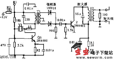 该发射机提供调整八木和其他波束天线用的远场信号源。Q1为Pience振荡器,工作在7.06MHz晶体的振荡主模,可用来测量20、15、10m频段的14.12、21.18、28.24MHz的场强。天线为两段1.5m长,连成偶极形式。T1是Amidon骨架T50-2,初级22圈,次级20圈带中心抽头。T2用同样骨架,初级22圈,次级5圈。