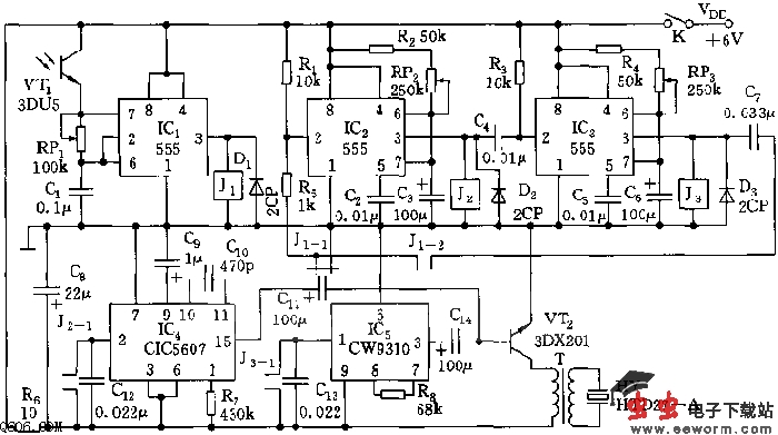 定时电路由IC2、IC3、R2、RP2、C3、R4、RP3、C5等组成。定时时间td=1.1(R+RP)C。调节RP2,使IC2的延时td1=1.1(R2+RP2)C3,约在5~6秒,使J2吸合,触发IC4,使音响电路刚好输出两句英语“Happy Birthday”。IC2暂稳宽度一结束,就触发由IC3和R4、RP3、C6组成的单稳态,使IC3置位,其延时脉宽为td2=1.1(R4+RP3)C6,约10~15秒,使之在J3吸合期间,由IC5演奏“祝您生日快乐”的电子乐曲。J3释放,再次触发IC2,如此循环,直至生日蜡烛被熄灭,语音与乐曲才停止。IC4采用CIC5607语音IC,内储“Happy Birthday”祝贺语,IC5采用CW9310,内储“祝您生日快乐”乐曲。