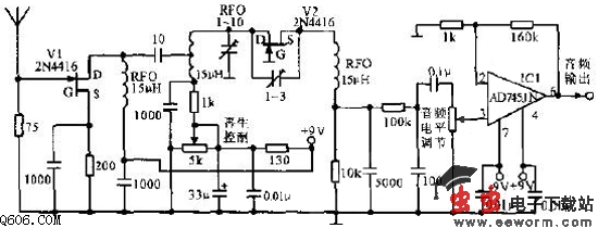 该图为使用结型场效应管的VHF频段超再生接收电路,其中V1为高放管,V2为超再生检波管,IC1为低频放大器。电路和灵敏度优于1uV,静态耗电小于10uA。
