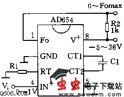 如图是用AD654的低成本压频变换器(VFC)。只要按图连接必要元件R1和C1,就可以成为VFC应用电路。电源电压可低至4.5V仍能保证性能,保证性能至16.5V,耗电最大3mA(空载)。最高频率520kHz。输入电压范围限于0~4V.输入量程Vi由电阻R1决定,即Vmax/R1=1mA。例如Vi=0~1V取用R1=1k欧,Vi=0~5V选用R1=5k欧。输出对应频率范围由C1决定,Fomax=1/10C1,频率单位kHz,C1单位用uF。例如,C1=0.1uF,则输出频率为0~1kHz;C1=0.001uF,输出频率范围为0~100kHz。也可以做双电源使用,即V-加负电源0~-15V均可。但总电源电压V+~V-不得超过36V.输出F0端(1脚)是集电极开路形式,可吸入电流8mA。输出波形是完全方波,并仍象其它VFC集成块波形为窄脉冲。这在某些场合是很有用的。