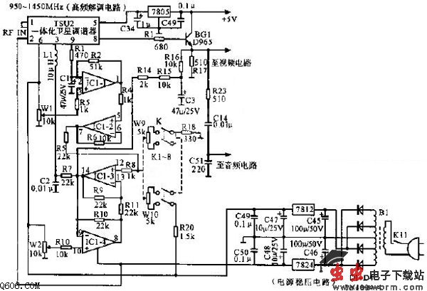该图为卫星电视接收机高频解调及电源电路。参数指值在图上,便于制作,成本低廉。高频解调电路采用TSU2一体化卫星调谐器,控制电路由四运放集成电路构成。电源电路由变压器B1、D1~D4整流及24V、12V和5V稳压电路构成。