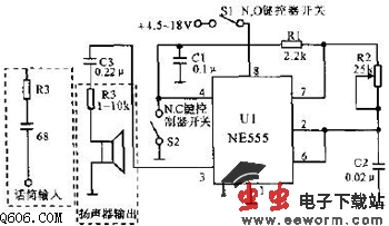 该电路使用NE555定时器的简单键控振荡器,作为解码带宽为2980~3080Hz转播机的自动插入电路。调R2可得到3042Hz。图中还示出了扬声器及话筒的输出选择。调R3得到需要的输入及输出电平,并可使用可变电阻。一般也可将闭合键控器开关接到7脚和地之间。可用9V晶体管收音机电源。