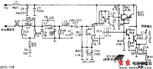 由高频解调电路送来的全电视信号,经滤波电路滤去伴音信号之后,经视频处理集成块NE592(IC4)及射随器,输出图像信号。该信号分为两路:一路送视频输出孔;另一路送电视信号调制器。本电路所需5V电压由上图电路引入。