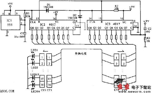 用555电路制作成频率f=1Hz的对称方波振荡器,由3脚接至IC2的CLK端,每送出16个脉冲,则按IC2:Q0~Q7;IC3:Q0~Q7的顺序轮流输出正脉冲,C2、R3为IC2、IC3提供开机清零信号,若不接则IC的输出顺序有可能不规则,按图连接无误,无需调试即可使用。
