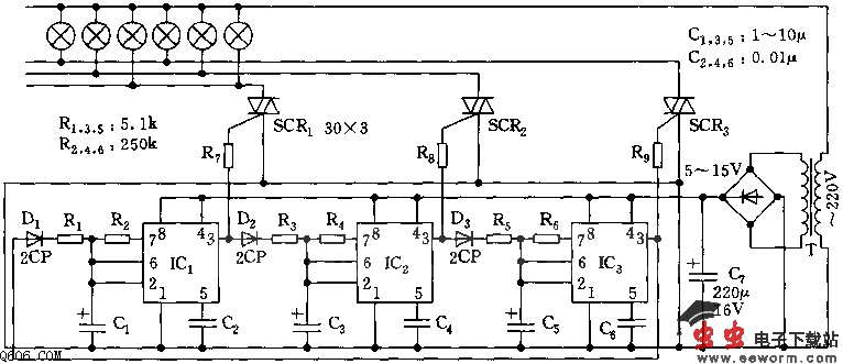 如图所示,彩灯控制电路以三支555为核心,组成循环触发单稳延时电路,分别控制各路的SCR循环导通,彩灯依次点亮,形似流水。