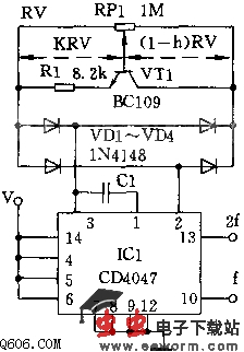 电路如图所示。只要用一只电位器RP1就使CD4047 CMOS振荡器的频率在1:100范围内任意调整,再接入一个作可变电阻用的晶体管,就构成了对频率成性线关系的调整电路。VT1的发射极电阻R1和可变基极电压共同设定集电极电流。二极管VD1~VD4构成的电桥以保证正、负半周期内对称工作。