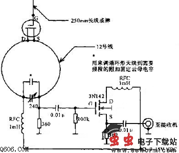 该天线使用了覆盖一个业余频段宽带工作的低Q值可调谐环形天线,用FET对10英寸鞭状天线的相位匹配,以给出全向接收图。用FET基极的微调电容把环形天线或是调到40m或是调到80m。环形天线的输出耦合到另一只FET 3N142(源跟随器),将环形天线的输出与进入接收机的50欧传输线的重负载效应隔离开。该天线性能可与40m全尺寸的四分之一波长垂直天线相比。可用电池,因为耗电只约2mA。