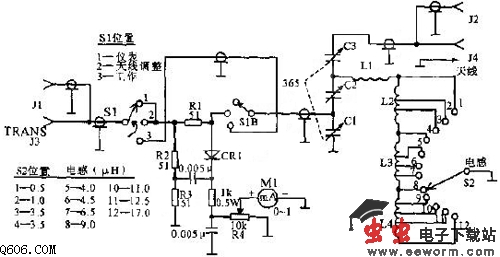 该电路的多抽头可变电感和三个广播调谐电容很容易被预调整到使低功率(QRP)发射机与业余频段的天线匹配到驻波比为1.将S1置于1位,将发射机的峰值输出馈送到J1(最大5W),调整R4得到M1的满刻度读值,然后在CR1~R1接点和地之间接上50欧电阻负载,此时表上偏移为零。记下调整位置,然后对其他发射机频率重复上述过程。完成调整后,把S1调到3位,越过电桥,发射机开始正常工作。