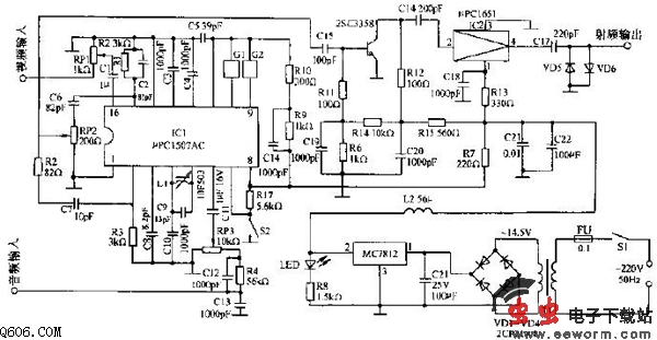 此电路由调制部分(uPC1507AC及外围元件)和放大部分(2SC3358、uPC1651)等元件组成。其输出的射频信号》105dB,可直接用于共用天线电视系统。视频信号经RP1、C1输入到脚16端,经处理后,在脚15输出75dB的图像射频信号。晶振G1、G2可选1~5任一互不相同频道的图像载频。S2用作G1、G2的切换开关,闭合时G1起作用。300mV音频信号经阻容元件耦合输入到IC1脚6,由脚2输出65dB的伴音射频信号,两路信号经C15耦合到2SC3358并由uP1651进一步放大。
