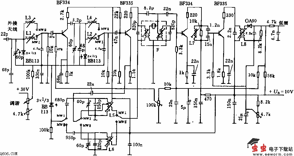 该电路示出汽车收音机高频和中频部分,中波I频段为520~950kHz,中波II为900~1640kHz。回路调谐采用调谐二极管BB113.