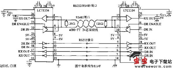 LTE1334芯片以充电泵结合RS232和RS485为一体。此器件有加倍器,反向充电泵,使RS232和RS485能在单5V供电下工作。应用中可以设置成4个RS232驱动器/接收器,加上2个RS485驱动器/接收器,或者一个RS485驱动器/接收器和两个RS485驱动器/接收器,RS232操作速度为250kbaud,RS485操作速度为10Mbaud,ESD保护高达10kV。供电电流<8mA,10uA关闭供电电流。图中所有的电容为0.1uF。传输线为4000英尺24芯双绞线。