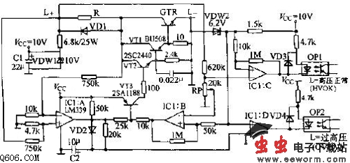 当电动机处于电动工作时,直流母线L+、L-之间的电压正常,IC1:A输出低电平,B输出高电平。VT1、VT2、VT3不导通,GTR不导通也不放电。光电耦合器OP1输出低电平。当发电工作时,直流母线电压升高到设定值时,IC1:B输出为低电平,VT3、VT2、VT1导通,GTR导通,直流母线上的高电压通过电阻R泄放,当GTR导通时,集电极的电压接近L-的电位,IC1:A由低变高,并通过D2对C2放电。放电达到正常值后,IC1:B变成高电平,则VT3、VT2、VT1、GTR关闭,放电结束。
