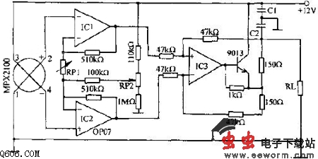 压力传感器MPX2100输出信号经IC1、IC2(OP07)构成的差动放大器放大,再由IC3(OP07)构成的增益为1的差动放大器放大后,驱动9013,以4-20mA电流的形式向负载RL输出压力信号,负载为位于50m三线电话电缆末端的250欧电阻。调节RP2使输出电流在无压力时为4mA;调节RP1使满压力100kPa时,输出电流为20mA。此电路可在机械加工、液面探测及流量控制等工业应用。
