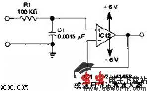 该简易滤波器采用一个RC滤波节和一个电压跟随器作为滤波元件,对于其他频率f3dB-1/(6.28R1C1),高于f3dB时的频率响应下降斜率为6dB/倍频程。