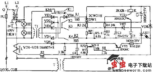 电路在焊条碰触焊件的瞬间,其电流互感线圈L的感应信号经整流、放大后使继电器K吸合,交流接触器KM吸合,向焊机提供380V施焊电源。当焊接停止数秒后,电路使交流接触器KM断开,切断焊机施焊电源。电路通过完成随时监测和响应焊机动态完成节能降耗功能。图中T1的匝数比为10:(1X2),L用0.23mm漆包线绕600匝,HD为380V氖泡灯。此电路可适用于BX系列的焊机。调节RP2可改变停止焊接时的KM断开时间。