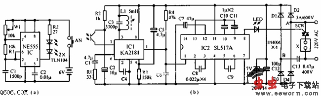 发射器采用555接成多谐振荡器,振荡频率约为35kHz,驱动红外发射管,其正向电流约为60mA。接收器由红外接收头、前置放大与检波、放大与双稳电路及可控硅控制电路等组成。专用红外集成块KA2818内部有前置放大、调谐、检波、AGC和波形修正电路,该电路输出负脉冲波。IC7为声控集成块SL517A,其功能包括:放大、翻转触发、驱动等,每接收一次红外信号,电路翻转一次,可控硅改变一次状态。