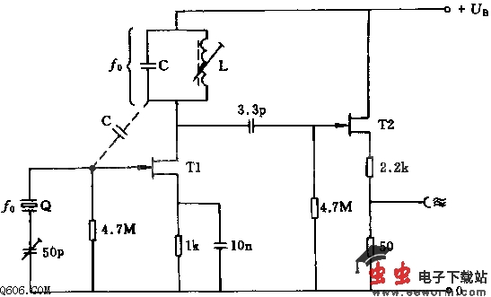 该振荡器采用基波石英晶体,其振荡频率可达10MHz。振荡回路调谐到谐振频率。电容C要求在4.7pF以下。后接源跟随器以与石英晶体回路隔离。