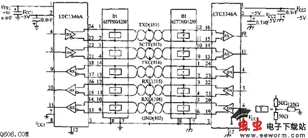 此图是用LTC1436A型在LAN/WAN或调制解调器(modem)应用中的V.35时钟和数据信号接口简化电路。LTC1436A具有三个V.35驱动器和接收器,传输速度达10MBd,供电电压为正负5V.常态时耗电流为6mA,在关闭状态时,供电电流低于1uA。可选择DET或DCE设置。为适应不良工作环境,驱动器输出和接收器均有高达正负10kV的ESD保护,在闲置、关闭或断电状态时驱动器保持高阻状态。在只有单5V供电时的应用场合,LTC1345附有充电泵以生成约5V供电电压。